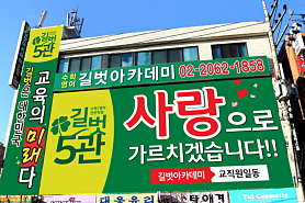 교육,상담문의 : 02-2062-1858 20년차!! 선생님도 매월 시험보는 학원!! 초, 중, 고등학생 대상 수학, 영어 전문학원으로 입문반, 도전반, 실력반, 최상위반(일등급반)이 운영되고 있으며, 자체 테스트를 거쳐 레벨에 맞는 반이 결정됩니다. 7명~10명 정원제(소수정예제)로 개인 맞춤교육이 이루어 지고 있으며, 초, 중, 고 학생의 경우 길벗아카데미만의 노하우로 집중력 강화 교육이 병행됩니다. 동시 수강과목으로 수학은 물론 영어, 국어를 수강할 수 있으며 수강생은 수시 모집 중입니다. 미리 예약한 후 오셔야 기다리지 않습니다.