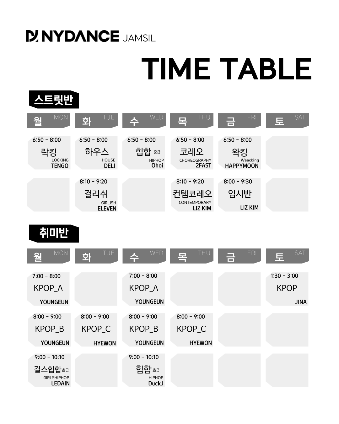 We Need Your dance, 당신의 웃는 얼굴과 즐거운 춤이 있는 그곳! 엔와이 댄스입니다. 전문 트레이너 및 강사진이 취미부터 입시, 오디션까지 원하시는 목적에 맞는 수업을 제공해 드립니다. - 수업 안내 1. 취미반 : 케이팝, 걸스힙합, 재즈, 키즈반 등 다이어트/건강/취미생활을 목적으로 쉽고 재밌게 배울 수 있는 댄스 초보자를 위한 수업입니다. 2. 전문반 : 힙합, 왁킹, 스트릿기초, 걸리쉬 등 특정 장르를 집중적으로 배우고 싶으신 분들을 위한 수업입니다. 3. 입시반 : 실용무용, 재즈댄스 등으로 진학준비 중인 학생들을 위한 과정으로 개인별 맞춤상담부터 기초레슨, 1:1 멘토레슨, 작품레슨, 모의실기까지 체계화된 커리큘럼으로 처음부터 끝까지 지도해드립니다. 4. 오디션반 : JYP, CUBE, FNC 등 대형기획사에서 활동 중인 전문 트레이너 강사진이 오디션 합격 노하우를 전달하고, 기획사 제휴를 통한 비공개 오디션 기회를 제공해드립니다. 5. 개인/그룹레슨 : 정규 수업 외 이벤트 준비, 1:1 집중 트레이닝 등 맞춤형 수업을 원하는 개인 및 소규모 그룹을 위한 프로그램입니다. 엔와이댄스 잠실점 공식 블로그 https://blog.naver.com/rhzhoska 에 오시면 할인 이벤트, 특강 일정 등 더 많은 소식을 보실 수 있습니다. 전화 문의 주시면 가격부터 강의 추천까지 친절하게 상담해드리겠습니다!