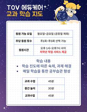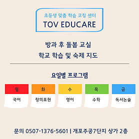 어린이가 행복한 곳 토브 에듀케어입니다. ※※※※※※긴급돌봄 및 매일 학습지도※※※※※※ ※※※※※※하교 후 픽업 서비스 제공※※※※※※ 국어, 영어, 수학, 과학, 사회 초등 전과목과 바이올린 및 통합교과를 과목별 전담 원장님이 지도합니다. 매일 학습 지도를 통해 학습에 절대적인 '엉덩이힘'을 기릅니다. 아이들의 지적 호기심과 흥미를 자극하는 로봇, 예술융합 창의력 커리큘럼도 함께 제공합니다. - 시간제 학습지도 및 돌봄 - 초등교육 전문 컨설팅 국제중, 예중, 국악중, 조기유학 상담 개포초, 양전초, 일원초 교과 및 수행평가 영재원 진학 지도 토셀 TOSEL 무료 모의고사와 30분 무료 상담 국어, 수학 무료 진단고사와 30분 무료 상담 네이버 예약으로 편리하게 예약가능합니다.