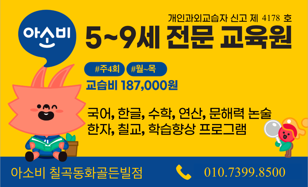 전국 2천여 개 교육원이 증명하는 아소비만의 학습 비결! 초등까지 쭉~ 아소비에서 공부해야 하는 이유는 무엇일까요? 1. 문해력 꽉 잡아주는 아소비 프로그램 특허받은 유치 한글 교재부터 탄탄한 초등 문해력 프로그램까지! 모든 교과 학습의 기본이 되는 문해력 키우기도 아소비에서 한 번에! 2. NO 스마트 패드, 100% 대면 수업 진행 터치가 아닌 연필로 직접 쓰고 풀어보는 대면 수업 방식! 진단 테스트 & SPTP 종합심리검사를 통한 개인별 맞춤 진도 설정으로 어렵지 않게 3. 건강한 공부 습관 잡아주는 유기농 학습법 숙제 No, 무분별한 선행 학습 No! 하루 1시간, 핵심 다과목 수업으로 스스로 공부하는 엉덩이 힘 기르기 4. 교육업계 유일 국무총리 표창 수상 3년 연속 KFA 수상! (장관상/협회장상/국무총리 표창) 2023년 교육 브랜드 중 유일한 정부 포상 영예 초등 공부, 처음부터 제대로 시작해야 하니까! 초등까지 쭉~ 아소비