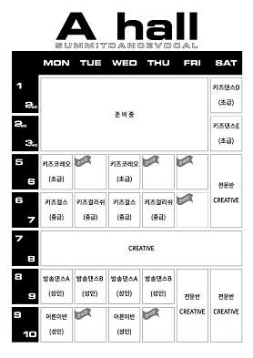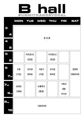 초등학교 고학년- 중고등생 대상 수업 4주 기준 7강좌 수업 수강 가능 수강강좌(기초) 기본기/리듬/힙합/왁킹/걸스힙합 수강강좌(안무) 걸리쉬코레오/힙합코레오/뉴트럴코레오 수강강좌(중급) 힙합/왁킹/하우스댄스/걸스힙합/소울댄스 수강강좌(고급) 입시반/오디션반