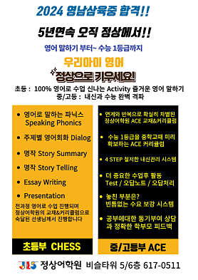 1. 정상어학원 입학 테스트는 레벨에 따라 2회의 레벨테스트를 실시합니다. (가정에서 온라인 테스트 1회, 학원에서 오프라인 테스트 1회) 2. 학원에서 실시하는 오프라인 테스트 비용은 1만원 입니다. 3. 각 테스트 소요시간은 약 40분이 소요됩니다. 당일 수강 등록 시는 테스트 비용은 면제됩니다. (수강료에서 공제 후 결제) 4. 무리한 학습 스케줄 후 테스트를 하는 경우 집중력 저하로 실력 발휘가 되지 못하므로 최상의 컨디션으로 테스트에 임할 수 있도록 신경써 주시길 바랍니다. ^^ 초등CHESS *100%영어로 수업진행되며 자연스럽게 영어지시를 알아듣고 표현하는 신기한 경험을 하게됩니다! 중/고 ACE 활용영어를 유지 발전시키며 성과를 극대화하는 정상어학원의 중등 프로그램입니다 활용1:성과3의 비율로 수업을 하는데요. 활용 수업 시간에는 미국 교과서로 배경지식을 쌓고 그 주제로 Speaking, Writing 수업이 진행되며, 성과 수업 시간에는 한국형 Reading, 문법수업으로구성되어, 영어의 4가지 영역을 골고루 수업 할 수 있습니다. 또한 정상어학원에서는 총 7단계로 원내 내신관리를 하고 전체 평균A등급을 이뤄내고 있습니다.