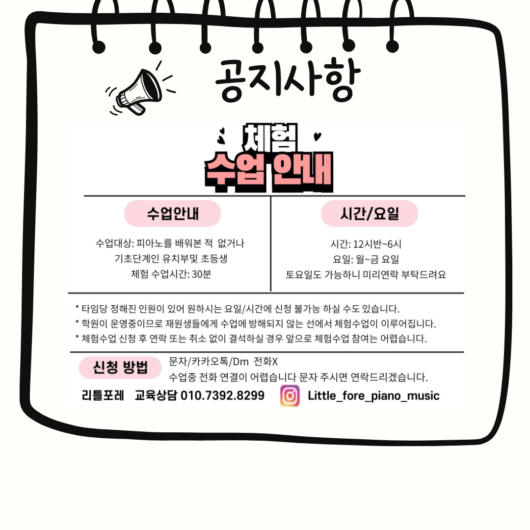 저희 원에서는 피아노 체험수업을 진행하고있습니다 피아노를 배워 본 적이 없거나 기초단계인 유치부 초등생이 참여 할 수 있습니다 ❤️체험 수업 시간은 30분입니다❤️ 오픈 기념으로도 첫달 교재와 레슨노트를 무료로 제공하니, 체험 수업 문의 주시면 자세히 안내 드리도록 하겠습니다😀 🎹 칠금동 현대아파트 상가 2층 202호🎹 ✔️피아노 전공 1:1 맞춤 레슨 ✔️체계적 수준별 맞춤 수업 ✔️성인반 오전 오후반 운영 ✔️매달 연주 영상 발송 ✔️정기적인 콩쿨 참여 ✔️금요 예술융합 특강 수업 ✔️학원어플로 등,하원 출결관리 1:1공지,전체공지,전달 ✔️레슨노트로 매일매일 기록 ✔️방학특강으로 교과과정 이론지도 및 수행평가 대비 ✔️학원 홀 향상 연주회