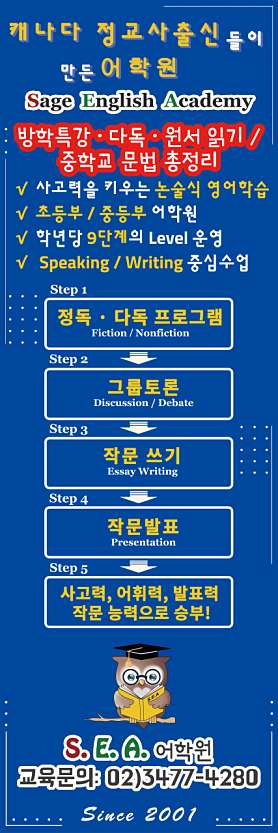 정독과 다독, 토론과 작문을 통해 종합사고력을 키우고 영어를 모국어를 습득하듯이 배울 수 있도록 학생의 성장 단계별 맞춤 교육을 실시하는 영어논술 전문 어학원입니다. 캐나다 교사 출신의 원장님과 원어민 교사들이 체계화된 시스템으로 초등학생과 중학생을 대상으로 수업을 진행합니다. 더 많은 정보는 저희 SEA어학원 블로그 또는 02-3477-4280로의 문의 전화를 통해 얻으실 수 있습니다.