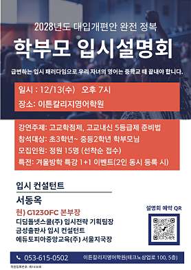 [초.중.고. 입시 영어학원입니다] *초등3~초등6학년 : 어학프로그램 영어원서, Essay Writing, 원어민 토론&발표 *중등1~중등 3학년: 수능 대비반, 학교내신 준비반 *고등부: 학교별 내신 집중반 상담예약: 053.615.0502