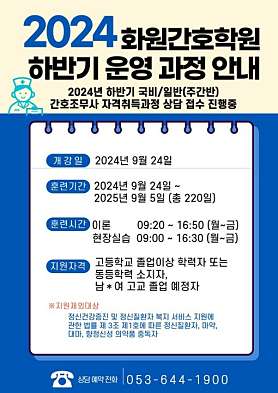 안녕하십니까 화원간호학원입니다. 현대는 전문인을 요구하는 시대입니다. 간호직은 보건의료 서비스를 제공하는 전문직업인으로서 자신의 건강은 물론 가족의 건강관리자의 역할을 할 수 있는 의료인력으로 일익을 담당하고 있습니다. 뿐만 아니라 의료기관에서 고령화 사회로 접어든 요즈음 간호간병통합병원, 노인전문병원, 요양시설 등 전문 간호직의 수요는 날로 늘어나고 있으며, 장기노인요양보험제도의 실시로 방문 간호서비스를 제공할 수 있는 인력으로서 그 역할이 기대되는 직종입니다. 또한 자격등 취득 후 간호대학 특별전형으로 진학할 수 있는 평생교육의 길이 열려져 있습니다. 사랑과 봉사의 간호이념으로 여러분을 성심껏 맞이하여 함께 하겠습니다. 우수강사분들이 강의 뿐만 아니라 여러분들의 장래를 가꿔가는데 최선을 다할 것을 약속드리겠습니다. *야간반 모집중 (상시운영) 수업시간 - 18:00 ~22:00 *학원 상담 문의 053-644-1900 월-금 : AM 09:00 ~ PM 18:00 토-일 및 공휴일 휴무
