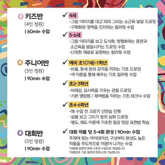 4세~13세 대상의 유초등 미술학원 예원, 서울예고, 이화여대 졸 원장 직강 *키즈(4-6세), 60분 *주니어(7-13세), 90분 드로잉/페인팅 위주의 아트 파운데이션 커리큘럼 타임별 소수정예 수업