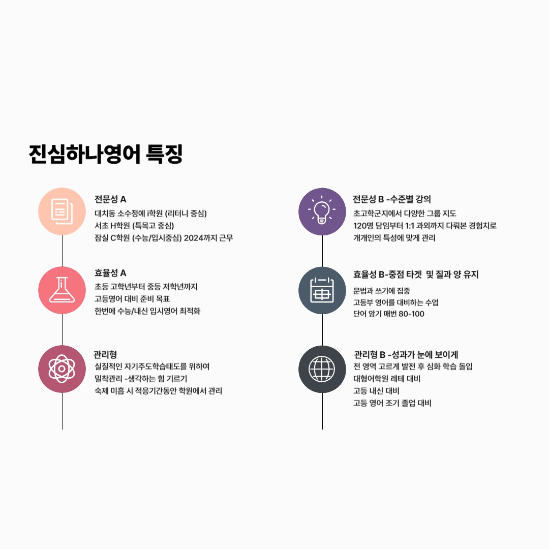 대치/서초/송파 경력 18년 대형 어학원 교수 팀장 출신의 소수 정예 수업을 영통구 벽적골 8단지에서 이제 경험해보세요. 학생의 자기 주도학습 태도 배양을 최우선으로 합니다. 초등 고학년(5,6학년)부터 고등학교까지 끊김 없는 커리큘럼을 지향합니다. 고등부는 영어학원 조기졸업을 목표로 합니다. 레벨 테스트 예약제로 진행합니다. 기재된 휴대폰 번호로 (학교/학년/레벨테스트 가능 날자/시간을 기재)문자로 예약 부탁 드립니다. 확인 하는 대로 연락 드리겠습니다. 수업 중에는 바로 연락 드리지 못하는 점 양해드립니다. 진심을 다해 가르칩니다. 열정과 태도만 가지고 오세요.