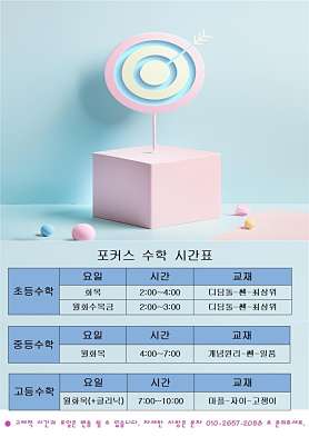 목동14단지 상가 a동에 위치한 초-중-고 수학교습소입니다. 다년간 목동과 대치동에서 수능&내신 수학과 수리논술 수업을 통해 많은 아이들의 내신 향상과 대학합격을 함께해왔습니다. 수학의 첫 걸음 -초등연산-부터 내신+입시까지 수리논술 노하우로 사고력+창의융합적 수업을 추구하며, 소수 개별 수업으로 아이들에게 실제 필요한 부분을 소통하고 같이 고민하면서 자기주도 학습을 유도합니다. 초등-중등-고등 새로운 교육과정(학점제) 에 맞추어 수학의 시작부터 내신 수능까지 탄탄하게! 너를 위한 수학을 디자인한다. 포커스수학입니다.