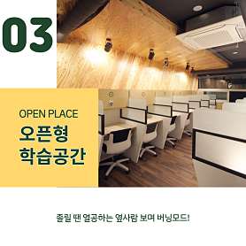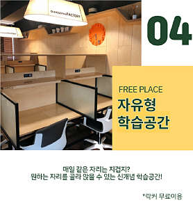 서울대,연세대 출신 크루가 직접 운영하는 공부가 잘 될 수밖에 없는 목동신정동 독서실+스터디카페입니다 [ WHY? ] 1. 맞춤 학습 공간 제공 (하단 공간구성 참조) 모든 사람은 자신만의 학습스타일이 있다! 2. 열심히 공부하는 당신, 누려라! * 회원님들의 의견을 통해 서비스 개선/추가되는중! 최적의 학습환경 - 전 공간 친환경 자작나무 인테리어 - 공기청정기, 가습기, 온도계, 백색소음기 구비 - 유인 면학분위기관리 즉각대응 최적의 학습 공간 - 전 좌석 콘센트 설치 - 전 좌석 와이드 데스크 - 전 좌석 색과 밝기 조절 가능한 친환경 고무나무 스탠드 - 전 좌석 인체공학의 대표 시디즈 의자 최적의 편의 서비스 - 없는게 없는 풍부한 대여서비스 - 따뜻한 차와 커피, 각종 음료와 간식 무제한 - 개인별 신발장, 사물함 - 자료 출력을 위한 프린터 완비 - 전좌석 빵빵한 와이파이 3. 걱정 없이 목표를 향해 전진하시길! 최적의 보안과 안전 - 완벽 출입관리 & CCTV 완벽 보안 - 안전한 귀가를 위한 입실/퇴실 문자 전송 서비스 - 카페형 공간을 제외하고 전 좌석 100% 지정석 - 남성/여성 별도 학습공간 - 남성/여성 별도 화장실 [ ONLY 여기에서만! 위너스 프로그램 ] 목표 달성까지 풀옵션 AI코칭X멘토코칭 AI 체어 & 앱 실시간 코칭으로 공부 효율 높이고! sky의치한 전문 멘토 실시간 질의응답 + 1:1 맞춤 멘토링 받자 [ 저희의 공간 구성은 이렇습니다 ] @그린시트: 독립형 + 오픈형의 장점을 모두 갖춘 오픈공간 속 나만의 공간 @싱글 : 나만의 독립된 공간에서 최고의 집중력을 발휘할 수 있는 공간 @오픈 : 목표 달성을 위한 최적의 에너지를 발휘할 수 있는 공간 @스탠딩 플레이스: 하루 30분 몸과 마음을 새롭게 정비할 수 있는 학습공간 @스튜닉(STUdy+picNIC): 분위기 좋은 아늑한 카페형 학습공간 @코러닝 플레이스: 함께 문제를 해결하는 공동 학습공간 @이팅 플레이스: 재충전할 수 있는 나만의 휴식 및 식사공간