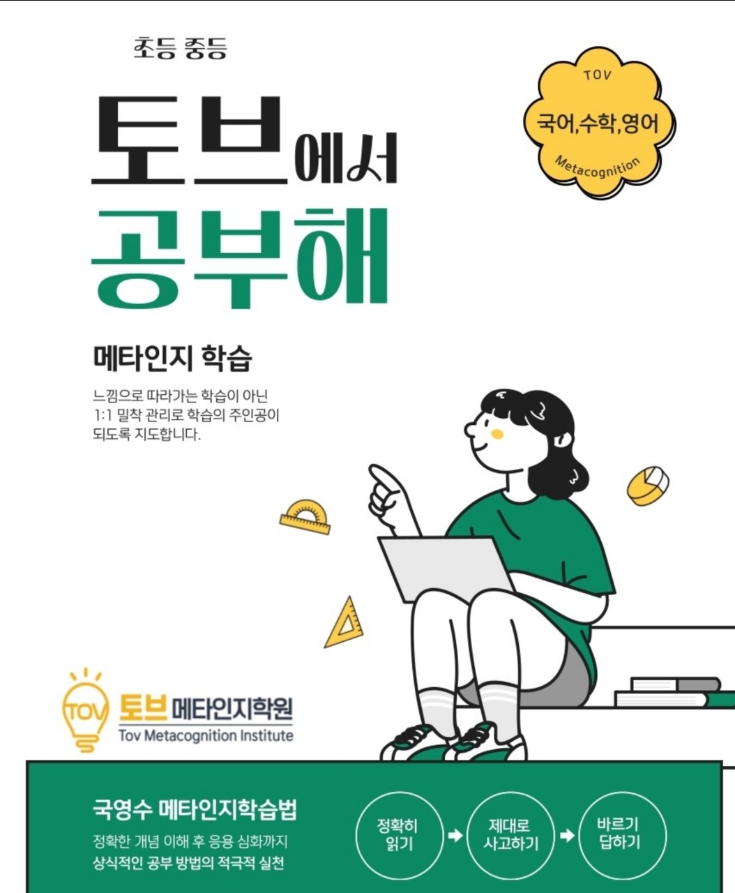 초,중 대상으로 국어, 수학, 영어를 지도하는 메타인지학습법으로 지도하는 학원입니다. 1.국어 -한자성어로 문해력을 높이고 인문,사회,과학, 철학 등으로 읽기 영역 확장. -중,고등 국어 수업은 토,일에 진행 2.수학 - 스스로 사고하고 풀 수 있도록 집요하게 개별 관리, 개별 진도 3.영어 - 문법, 어휘, 독해 및 writing 능력을 개인 수준에 맞게 빌드업. 수능 1등급 까지 4.고전슬로리딩 -천천히, 정확히 읽는 독서습관을 배양하고 의미를 깊이 파악해 가는 시간 5.논술 -어떤 글이 좋은 글인지 먼저 인지한 후 글을 쓴다. 그룹 비평과 첨삭의 과정을 통해 논리적이며 창의적인 본인의 글을 쓰는 훈련 과정