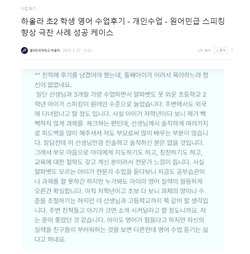 하올라 초2 학생 영어 수업후기 - 개인수업 - 원어민급 스피킹 향상 극찬 사례 성공 케이스