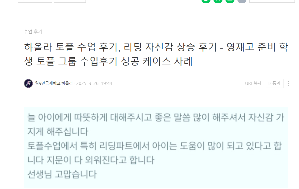 하올라 토플 수업 후기, 리딩 자신감 상승 후기 - 영재고 준비 학생 토플 그룹 수업후기 성공 케이스 사례