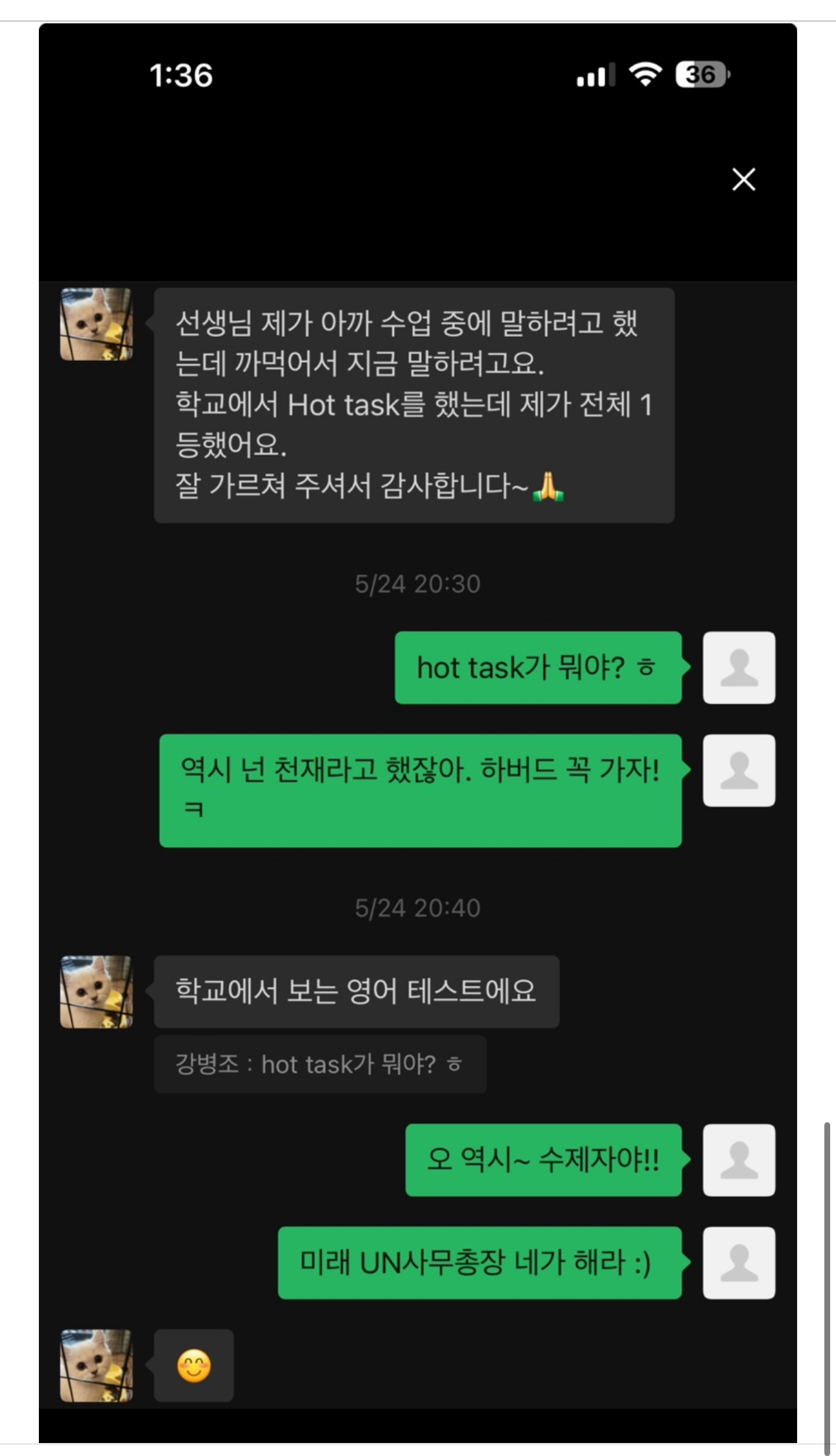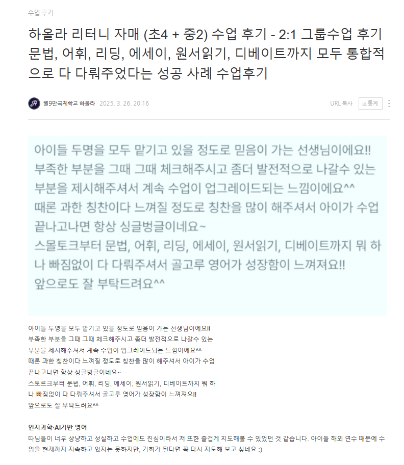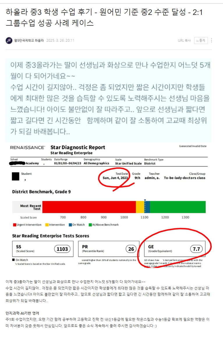 하올라 중3 학생 수업 후기 - 원어민 기준 중2 수준 달성 - 2:1 그룹수업 성공 사례 케이스