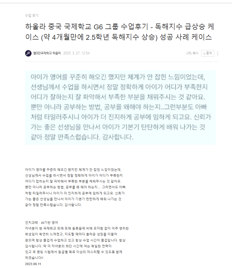하올라 중국 국제학교 G6 그룹 수업후기 - 독해지수 급상승 케이스 (약 4개월만에 2.5학년 독해지수 상승) 성공 사례 케이스