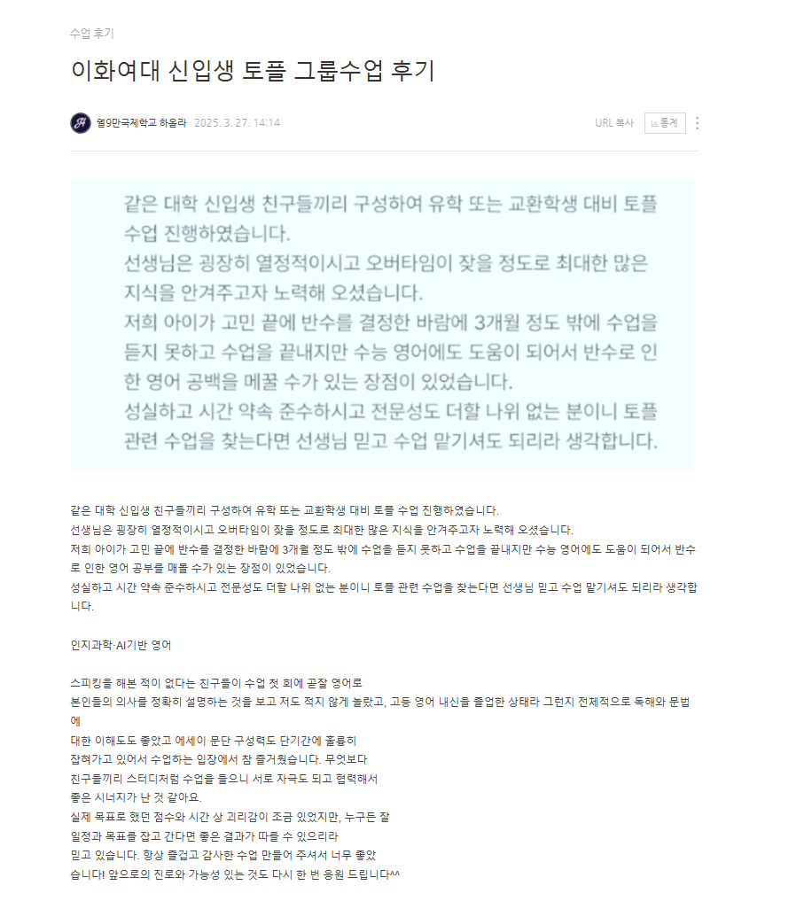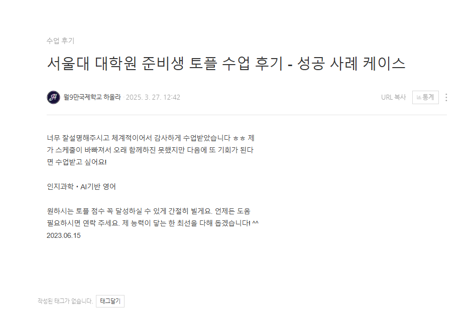 서울대 대학원 준비생 토플 수업 후기 - 성공 사례 케이스