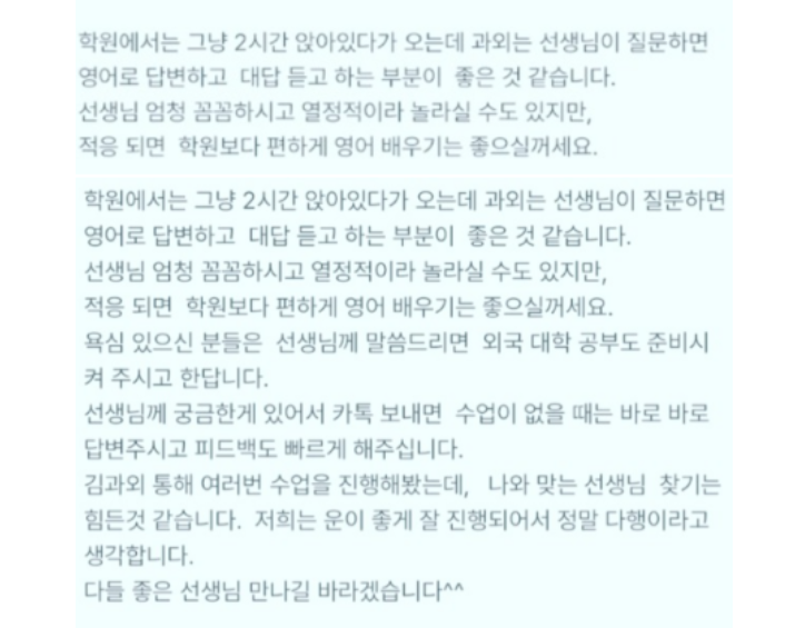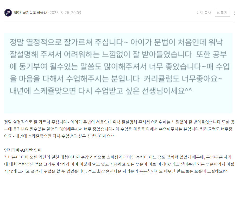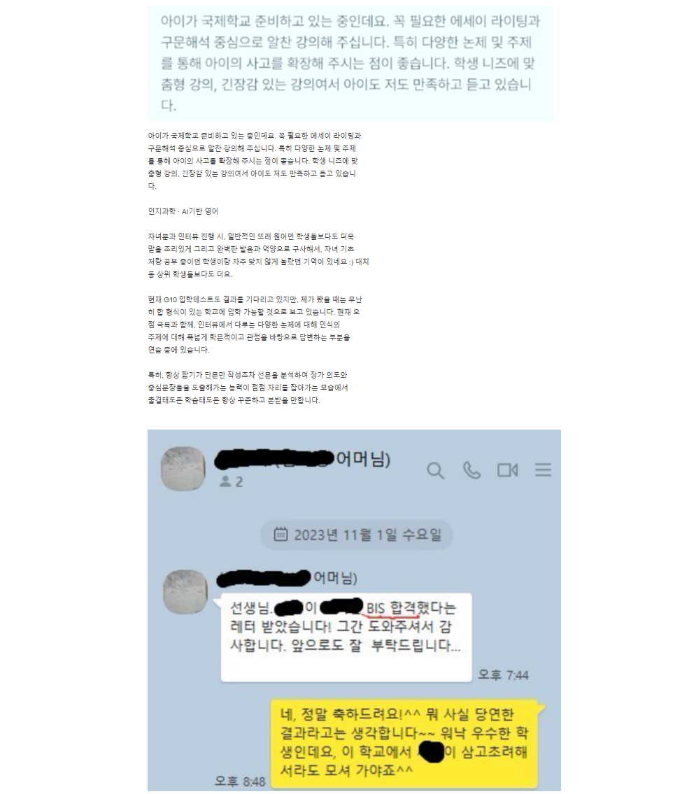 ✔ 인지과학과 AI 기술 활용 미래형 융합교육 모델 ✔ 인천자유경제지역청 송도 글로벌 교육 허브 및 글로벌 인재양성 협력 파트너 ✔ 서울경제TV 조영구의 트렌드 핫이슈 공중파 방송 출연 ✔ 제20회 대한민국 교육산업대상 수상 ✔ 2025 혁신한국인 & Power Korea 대상 수상 ✔ 글로벌(미국) 온라인 방송 플랫폼 GatherVerse 정기 패널리스트로 참여 중 - Tech for Humanity Summit (GatherVerse Europe / Africa / Asia / North America / South America 등) ✔ "김과외 약 60만 명 선생님 회원 중 토플 부문 1위, 전체 영어 부문 10위권 내 위치“ - 국제학교/유학 영어 베이스 쌓기 및 입학 준비 관련 전문성 확보 ✔ The Miami USA Global Women Empowerment & Women Influencers Network Summit Keynote Speaker ✔ Dubai Global Icons of Impact 2025 글로벌 아이콘으로 선정 ✔ The Global Chamber (글로벌 상공회의소) Entrepreneur Member ✔ "모두"를 위한 국제학교 교육 | 월 9만원 국제학교 교육 효과 이니셔티브 | AI 기술과 인지과학 활용 미래형 융합교육 모델 * 제공 서비스 1. Only AI 관리 (& 학습코칭) 프로그램 (필요시 간헐적인 유선/줌 미팅 통한 가이드 제공) - 월 9만원 2. AI 관리 프로그램 (& 학습코칭) + 1:1 지도 - 월 9만원 + 32만원 3. AI 관리 프로그램 (& 학습코칭) + 2:1 지도 - 월 9만원 + 55만원 국제학교 교육 효과 월 9만원으로 충분히 가능합니다. 심지어 베이스가 많이 약해도 상관이 없습니다. - 어학 능력과 지식 측면만 보면, 지금 AI 시대에는 유학이, 학교가 정말 필요가 없을 정도임을 수 많은 세계 전문가들이 의견을 같이 하고 있습니다. “어떤 공부이든 초밀착 맞춤형으로 융통성 있게 모두 AI와 효율적 학습전략 응용/적용하여 진행 가능합니다!” ✔ 방법이 너무 시대를 앞서가는 선진적 방법이라 혹은 학원 플랫폼에서 어필을 하니, 인간의 인지편향으로 많은 분들이 신뢰하지 못해 안타까운 마음입니다. 좋은 걸 전 세계적으로 나누려고 합니다. 그 누구라도 최상의 교육 받게 하려 합니다. 공교육이 해결 못하면, 저 같은 사교육자라도 나서 해결해야 한다고 생각합니다. 의심하지 마시고, 한번 시도해보세요!! ✔ 학생들의 메타인지 극대화 전략을 병합한 AI 피드백 관리 시스템이라, “학생이 원하는 만큼, 소화 가능한 만큼,” 학생에게 필요한 각 종 발표 자료, 본 자료들에 대한 AI 생성 원어민 음원, AI 발표 영상 스피치 분석 리포트를 ”무제한“으로 제공 가능합니다. 이제 정말 열정만 있다면, 그 누구나 UN사무총장을 꿈꿀 수 있는 시대가 바야흐로 찾아왔으니, 제발 교육비 걱정 말고 우리 모두 자녀들을 많이 낳아, 애국합시다! “제주 영세민 가정 출신인 제가 여기까지 왔으면, 전 세계인이 모두 가능하고, 20대 초반에 처음 논리적 말하기와 영어 스피킹을 해본 제가 여기까지 왔으면, 전 우주인이 가능합니다!” ✔ 논리/추론 기반 체계적인 필수 배경지식 (혹은 학교 시험에 필요한 과학, 사회, 국어, 수학, 토플, 아이엘츠, SAT, IB, A-level, AP 등관련 어떠한 학생 측 요청 지문이라도 가능) 지문 요약/발표 및 원서 스토리텔링 방법 가이드 후, 학생 발표 영상에 대한 AI 스피치 분석 피드백 리포트 제공 / 에세이 피드백 리포트 제공 (노베이스도 충분히 가능!) ✔ 지문 요약 후 발표 및 스토리텔링 영상 촬영을 통한 의식적, 무의식적 학습법만으로 학생의 스피킹, 라이팅, 문법, 어휘, 독해력, 분석력, 이해력, 논리/추론력, 암기력, 배경지식, 심지어 학생들 두뇌 확장 (지능 상승) 효과까지 한 번에 다 해결 가능한 모델 (통합형 학습법으로 과제 부담 완화 & 각 종 학원비 및 수업료 절감 효과 ) ✔ 바로 발표 영상 촬영 및 AI 피드백 관리와 학습코칭만으로 자녀분들을 맡기는 것이 불안하신 경우에는, 약 1-3개월 간, 학생이 필요한 공부를 함께 가이드해나가면서, 메타인지와 같은 학습능력을 향상시킴과 동시에 효율적인 학습을 가능하게 하는 노하우를 전수하며, 학생이 숙지하고 적응하는대로 점차 실시간 수업시간을 줄이고, 좀 더 많은 부분을 AI 관리 프로그램으로 전환해서, 학습효과는 극대화하고 수업료는 급절감시키는 방안으로 접근하는 방안도 고려 가능합니다. - 2인 그룹수업 매칭도 가능합니다. ✔ 자녀분과 함께 별도의 공간과 시간에, 학부모님들의 친구분들 그리고 학생들의 친구들과 함께 한데 모여 정과 사랑을 나누고, 학생들이 학습의 게임/스포츠 같은 재미를 느낄 수 있도록, 학생들이 발표한 내용과 관련해서 충분한 시간적 여유를 두고 토론할 수 있게 다양한 질문들과 모범 샘플 답변도 얼마든지 제공 가능합니다. 극 개인화된, 극 자본주의 사회, 마음 닫힌 사회 이제 종식시키고, 국가기밀 말고는 모두 아는 것을 나누고, 아이들 두뇌확장하고, 서로 돕고 상생하며 행복감 급 증진시켜, 좋은 선생님 좋은 전략 나만 알고, 우리 아이만 좋은 학교/학원 보내는 게 최선이 아니라, 함께 나누고 학생들 스스로 서로 배우고 가르치며 (메타인지 및 두뇌확장 극대화 전략) 살게 하는 게, 더욱 최상의 학습결과도 낳는다는 것을 우리 이제 그만 깨닫고 계몽하고, 아이들 뇌 안의 신경전달물질 불균형 그만 좀 야기시키고, 이들을 만성적 우울 우물 안에서 구출해냅시다!! - 그런 측면에