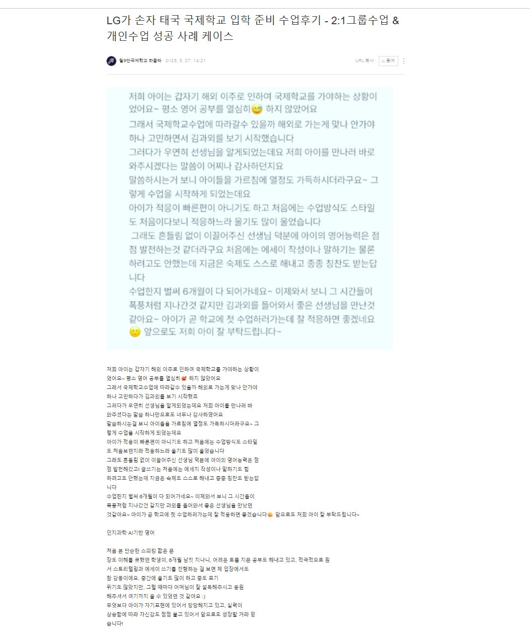 LG가 손자 태국 국제학교 입학 준비 수업후기 - 2:1그룹수업 & 개인수업 성공 사례 케이스