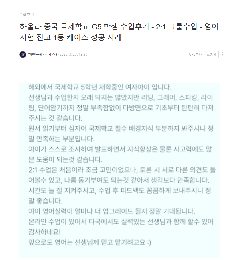 하올라 중국 국제학교 G5 학생 수업후기 - 2:1 그룹수업 - 영어시험 전교 1등 케이스 성공 사례