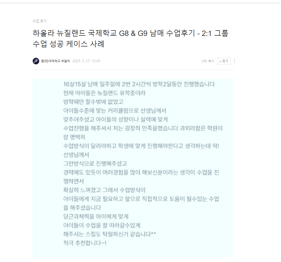 하올라 뉴질랜드 국제학교 G8 & G9 남매 수업후기 - 2:1 그룹수업 성공 케이스 사례