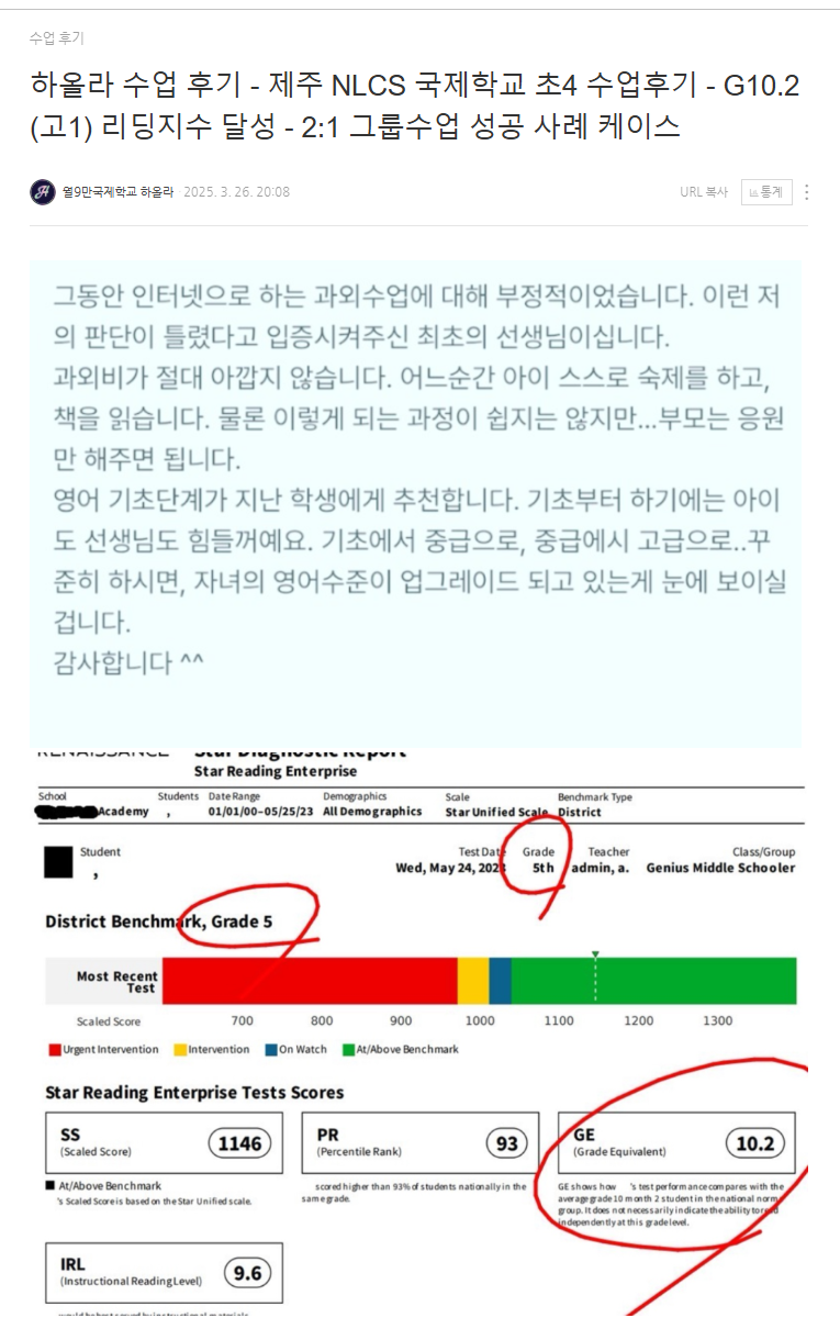 하올라 수업 후기 - 제주 NLCS 국제학교 초4 수업후기 - G10.2 (고1) 리딩지수 달성 - 2:1 그룹수업 성공 사례 케이스