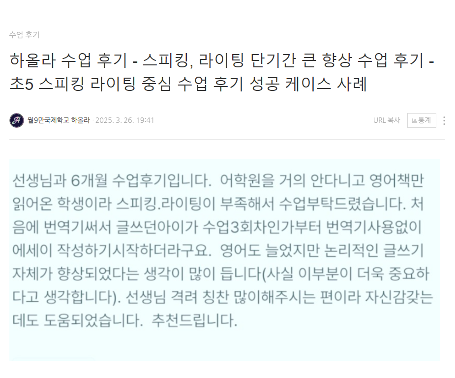 하올라 수업 후기 - 스피킹, 라이팅 단기간 큰 향상 수업 후기 -초5 스피킹 라이팅 중심 수업 후기 성공 케이스 사례