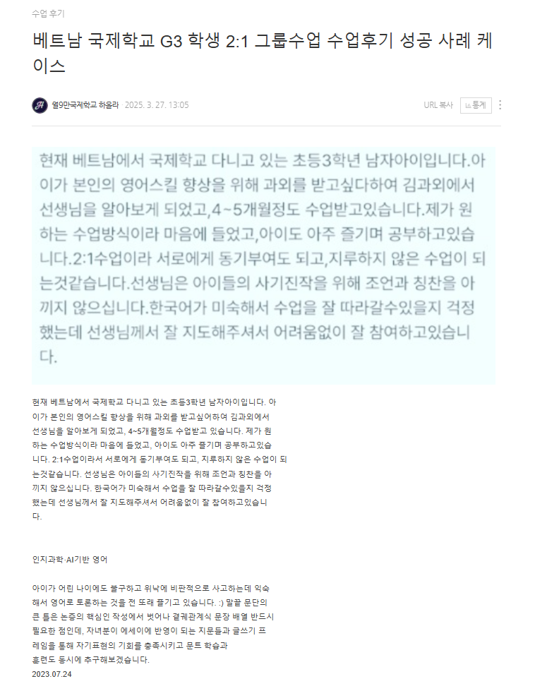 베트남 국제학교 G3 학생 2:1 그룹수업 수업후기 성공 사례 케이스