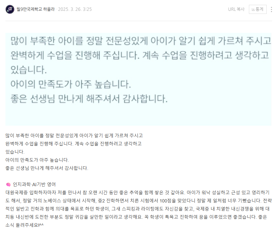 대원국제중 중1 학생 수업후기 - 하올라 학생 만족도 높은 내용 후기 성공 케이스 사례