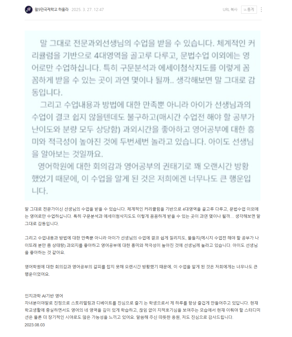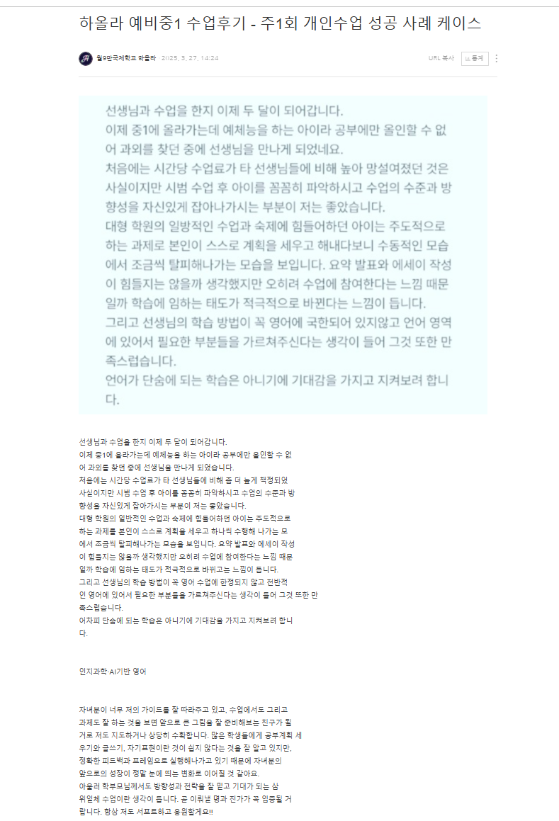 하올라 영어논술 강점 수업후기 - 성공 사례 케이스