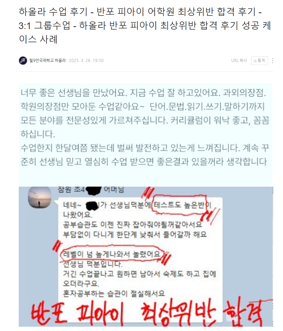 하올라 수업 후기 - 반포 피아이 어학원 최상위반 합격 후기 - 3:1 그룹수업 - 하올라 반포 피아이 최상위반 합격 후기 성공 케이스 사례