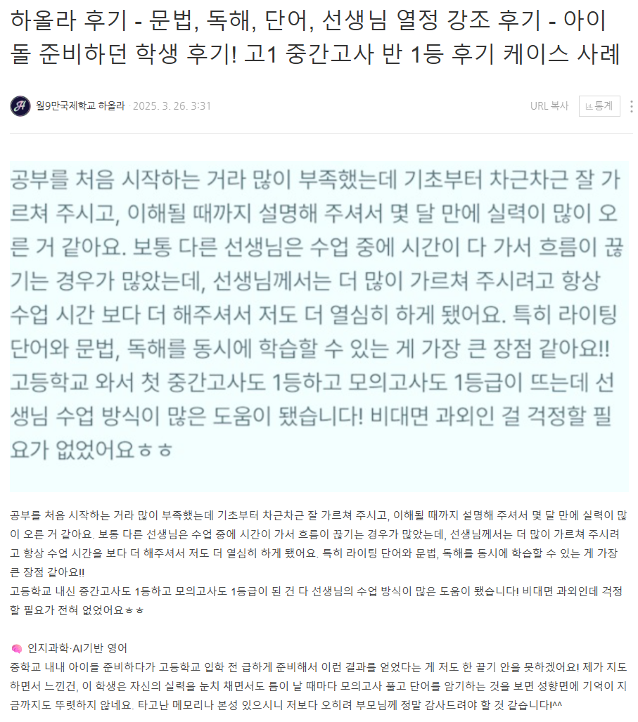 하올라 후기 - 문법, 독해, 단어, 선생님 열정 강조 후기 - 아이돌 준비하던 학생 후기! 고1 중간고사 반 1등 후기 케이스 사례