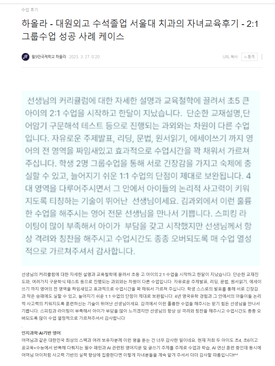 하올라 - 대원외고 수석졸업 서울대 치과의 자녀교육후기 - 2:1 그룹수업 성공 사례 케이스