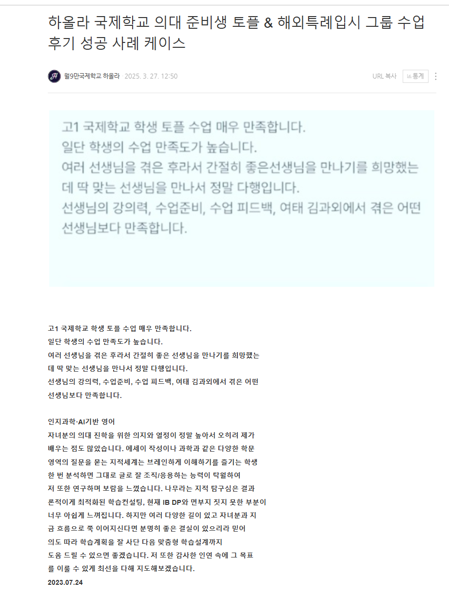 하올라 국제학교 의대 준비생 토플 & 해외특례입시 그룹 수업후기 성공 사례 케이스