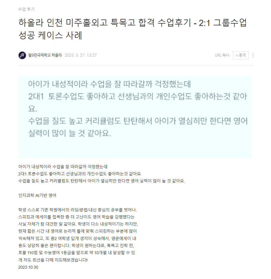하올라 인천 미주홀외고 특목고 합격 수업후기 - 2:1 그룹수업 성공 케이스 사례