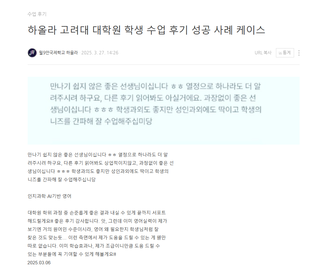 하올라 고려대 대학원 학생 수업 후기 성공 사례 케이스