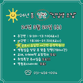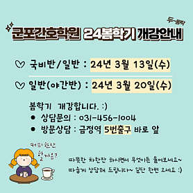 간호조무사자격증 취득을 목표로 1년 동안 이론수업과 병원실습을 진행하는 과정입니다. 군포간호학원은 금정역5번출구 바로 앞에 위치하고 있으며, 28년 동안 한 자리를 지켜오는 군포시 명품 간호학원입니다. 내일배움카드 과정을 운영하고 있으며, 일반과정(주/야) 과정을 모두 운영하고 있습니다. 다양한 특강과정을 통해 자신의 건강을 관리하고, 가족의 건강을 책임질 수 있는 능력을 배양하는 학원입니다. 여러분의 합격과 취업을 군포간호학원이 함께 합니다. 함께하는 간호조무사학원 군포간호학원입니다.