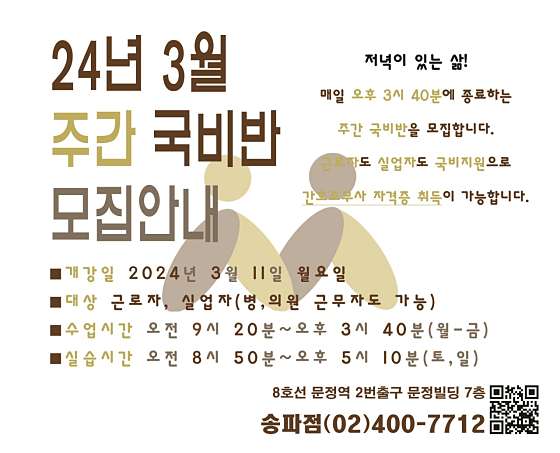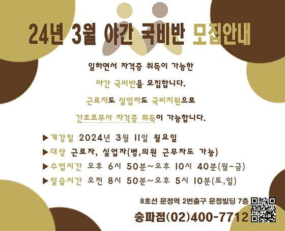 국비지원 교육 가능, 최고의 강의로 주간/야간반 운영, 쾌적한 강의실과 실습 환경, 높은 합격률과 취업률, 베테랑 교수진, 인근 병의원 실습, 취업까지 원스톱 관리