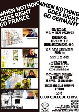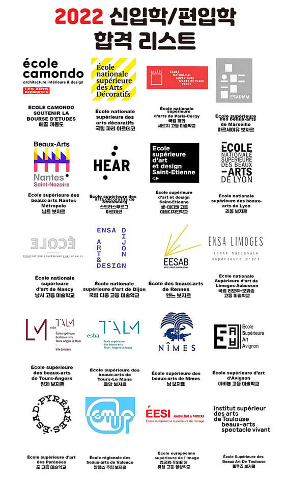 프랑스 독일 유럽 전문 미술유학 포트폴리오 학원 2022년 프랑스 그랑제꼴 4개 2년 연속 합격 2020-2022년 프랑스 그랑제꼴, 22개 예술대학 합격 프랑스 파리 현지분원 보유, 원장직강, 다양한 커리큘럼, 심화집중수업 홍대입구역 9번출구 도보 10분 / 홍대정문 도보 3분 무료유학설명회, 상시상담 프랑스 파리 현지 분원 보유 프랑스 파리 현지 분원에서 실전 면접대비 집중 수업 진행 서울 서부교육지원청 등록 제A0220190103호