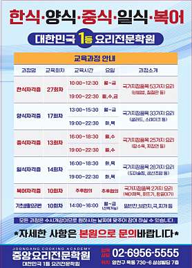 양천구 목동 최고의 조리교육기관으로서 조리기능장원장의 직강으로 수업이 이루어집니다. 한식,양식,중식,일식,복어 자격중 및 조리산업기사와 조리기능장 까지 모든 조리관련 자격증이 오픈되어있습니다. 자격증과정 외 생활요리 및 창업과정 진행중입니다.