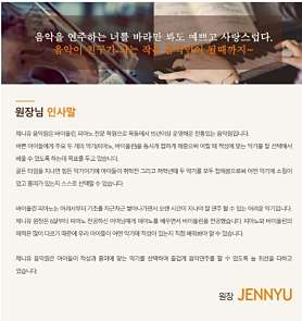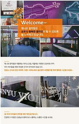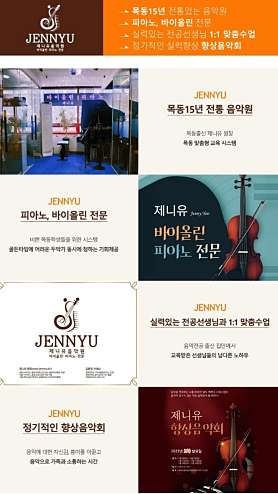 안녕하세요. 목동 목운 초,중학교 앞에 위치한 피아노,바이올린 전문 음악원으로 15년이상 운영해온 전통있는 음악원입니다. 바쁜 아이들에게 주요 두 개의 악기(피아노, 바이올린)을 동시에 접하게 해줌이로써 어떤 악기가 소질이 있고 흥미가 있는지 스스로 선택할 수 있습니다. 1. 제니유 음악원 시스템 1) 목동 15년 전통 음악원-> 목동 출신 원장, 목동 맞춤형 시스템 2)피아노, 바이올린 전문 -> 바쁜 목동 학생들을 위한 시스템 골든 타임에 어려운 두 악기 동시에 기회 제공 3) 실력있는 전공 선생님과 1:1 맟춤 수업 -> 음악 전공 출신 집안에서 자란 남다른 티칭 노하우 4) 정기적인 향상음악회-> 음악에 대한 자신감 향상 , 음악으로 가족 과 소통하는 시간 2.제니유 수업 안내 1)8회 기준 횟수제 수업 -> 당일 수업 취소까지 가능 (횟수 포함되지 않음) , -> 매회 1회 차에 수업 날짜와 함께 공지 2)1:1 맟춤 수업 -> 레슨과 연습 병행 -> 연습 노트를 통한 관리 3) 수업방식 A타입 : 피아노, 바이올린 80분 수업 B타입: 바이올린 60분 수업(바이올린 전공 선생님과 이론 포함) C타입: 피아노 60분 수업(피아노 전공 선생님과 이론 포함) 4)정원제 수업 -> 한타임 3~4명정우너(악기별) ->매주 지정된 시간에 수업(지정된 시간은 상시협의 변동가능) 3. 선생님 소개 1)독일 유학파 선생님 2)피아노 바이올린 선생님 모두 석사 출신 3)음악 교육 대학원 출신 4) 아동심리 자격증 및 정교사 교원 자격증 제니유 음악원은 아이들이 적성과 흥미에 맞는 악기를 선택하여 즐겁게 음악 연주를 할 수 있도록 늘 최선을 다하고 있습니다.
