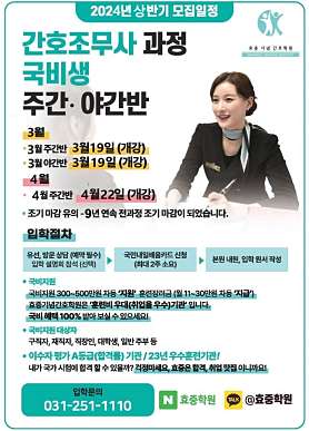안녕하세요 수원에 위치한 효중기념간호학원 입니다. 저희는 최고의 시설과 강사진으로 여러분들에 차원이 다른 교육의 서비스를 지원합니다! 저희 강의실은 각자의 반이 전담으로 쓰고 있고 안에 사물함,냉장고,전자렌지,토스트기,커피포트 노트북등 마련이 돼있습니다. -실습관련- 그리고 실습실의 경우 강의실보다 더욱 넓은 장소가 제공되며, 실제 병원에서 쓰는 최고의 기자재들이 모여있어 실감나는 실습이 가능한 특징이있습니다. 아무래도 간호조무사 자격증을 취득하기위해서는 충분한 이론+실습시간이 뒷받침되야하고 1년 이상의 시간이 소요돼기때문에 간호학원은 아무렇게나 선택하시면 안됩니다. 꼭 등록하기전에 내부 시설 및 어떻게 교육이 진행되는지 잘 상담받아보셔야하고 수원내 합격률과 취업률을 꼭 따져보시고 꿈을 위해 도전해보시기 바랍니다. 수원간호학원 알아보고 계신다면 편하게 상담전화주시면 친절하고 자세한 설명해드리겠습니다. 수원간호학원 수원간호조무사학원 국비무료교육 국비지원 간호조무사자격증 취업률 우수기관 최고의 합격률