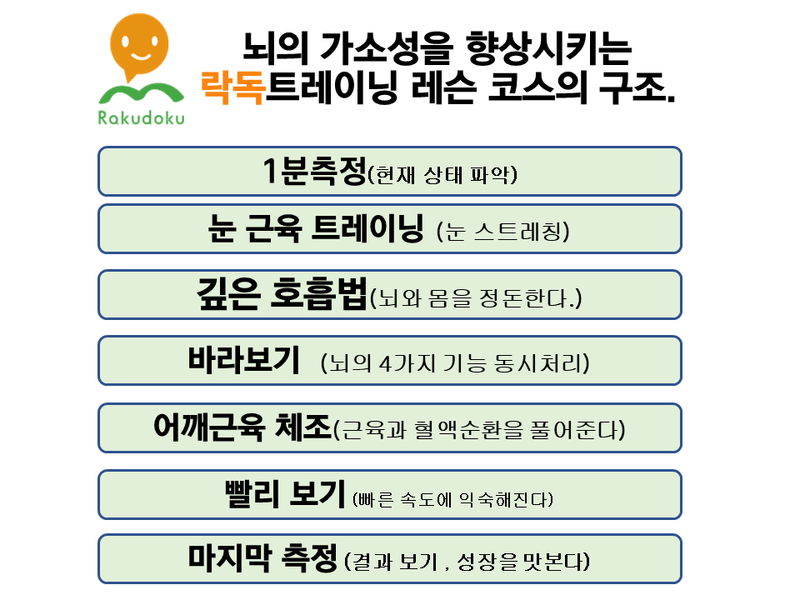 8개월 1주 1시간 수업 1. 독서 속도 1분 측정 2. 눈 근육 운동 3. 깊은 호흡 4. 우뇌 깨우기 5. 몸 스트레칭 6. 글 빨리보기 3회 7. 15초 독서 속도 측정