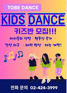 댄스와 무용을 취미반부터 전문인반까지 배울수 있는 곳입니다~ 성인뿐아니라 키즈반과 기획사 오디션반등으로 나누어져 있어 아이들을 위한 프로그램도 있습니다~ 방송댄스, 코리오안무, 재즈댄스, 힙합, 걸스힙합,재즈리릴컬(모던댄스) , 기초발레, 현대무용등 다양한 클라스가 있습니다~ 저희 투비댄스는 일반인 분들이 춤을 즐길수 있는 공간입니다^^