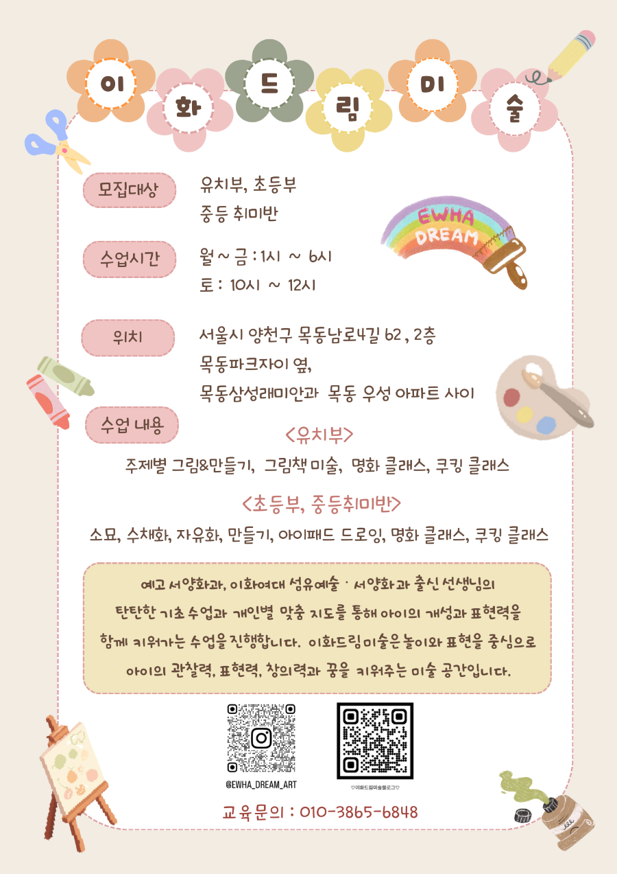 🎨 아이의 상상력과 꿈이 자라는 미술 공간, 아이들이 미술을 ‘공부’가 아닌 ‘즐거운 놀이’로 경험하는 곳, 이화드림 미술입니다💛 유치부(5-7세)부터 초등부, 중등 취미반까지 연령과 발달 단계에 맞춘 맞춤형 미술 교육을 통해 회화의 기초는 물론, 아이 한 명 한 명의 개성과 표현력을 소중히 키워갑니다. 단순히 그림을 잘 그리는 것보다 ✔ 스스로 생각하고 ✔ 자유롭게 표현하며 ✔ 미술을 통해 자신감을 얻는 경험을 중요하게 생각합니다. 🌈 수업 특징 °기초 회화 + 개별 맞춤 지도 °놀이처럼 즐기는 창의 미술 수업 °오감을 깨우는 미술 놀이 중심 활동 🍰🎨 다양한 특별 클래스 °즐거움이 배가 되는 쿠킹 클래스 °작품 속 이야기를 만나는 명화 클래스 °손으로 만들며 배우는 공예 활동 ❤️ 매 수업마다 아이의 수업사진&수업내용 피드백 전달해드립니다 수업/상담 문의 : 010-3865-6848