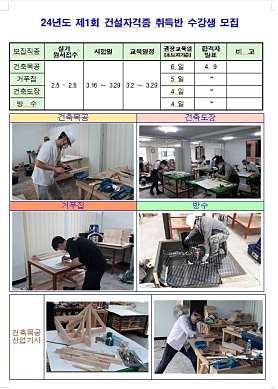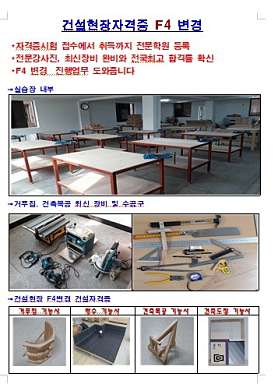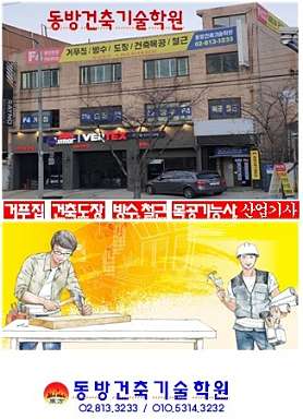 1. 큰꿈을 안고 교육장 개설 40년 대학교 건축기술 교육경험 교수님과 건축과 졸업 건축현장 실무경험 원장님이 뜻을 모아 서울 대림동에 기술전수와 후진양성을 위해 교육장을 만들었습니다 2. 교육의 질 실습장에서 1명의 강사가 15명 이상의 인원을 교육했을 때 교육생의 기술 습득율이 현저히 떨어져 자격증 합격율이 낮습니다 3. 단기간의 차별화 교육 단기간의 교육, 즉 4일 내지 7일교육을 할 때 많은 인원 교육할 때와 소수인원을 교육했을 때을 비교해 보면 엄청난 차이점을 보입니다 다른 교육기관과 차별화 교육을 위해 소수인원 맞춤교육으로 100% 합격을 목표로 1대1 교육방식 택했습니다 4. 이익보다는 기능 양성을 추구 전문건설 면허을 위해, 취업을 위해 또는 동포 여러분의 F4비자 발급의 절박한 사정을 알고 심층상담을 통해 개개인의 어려움을 알고 있기 때문에 이득보다는 합격이 우선이다는 점을 감안하여 많은 인원보다는 1일 6명이하 교육을 하고 있습니다 더불어 작금의 코로나 어려움에 동참하고자 일부종목 수강료를 13%~21%인하하여 기능 양성을 추구하겠습니다 5. 24시간 상담과 자격증 접수에서 발급까지 대행 건설면허, F4비자 발급 등 여러 궁금한 사항이 있으면 언제든지 전화 주세요. 상세히 답변 드립니다 자격증 접수가 어려우시면 접수에서 발급까지 서비스 차원에서 대행하고 있습니다 저희 학원을 믿고 비교하여 주세요 동방 건축기술학원 02) 813~3232.3233, 010.5314.3232