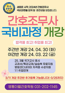 2013년에 개원 2022년 5년 우수훈련기관 선정!!! 수원지역 최고의 간호학원! 훈련생 한분 한분을 진심으로 관리해 주고 배움에 열정을 갖고 계신 훈련생 모두를 환영합니다! 국비 주간반,국비 야간반 운영중이며 2018~2023년 국가고시 연속 100%합격을 자랑하고 취업율과 합격율 높은 수원 영통에 있는 영통더웰간호학원 입니다. 국비주간반 국비야간반을 운영하고 있으며 입학상담을 원하시는 모든 분들과 소통하고 있습니다! 수원, 영통, 신영통, 서천, 흥덕, 광교, 병점, 망포, 신갈, 수지, 죽전, 용인, 동탄, 화성, 오산 등 에 거주하시며 간호조무사과정에 관심있는 모든 분들의 방문을 응원합니다. 영통더웰간호학원, 야간반국비, 국비주간반, 국비야간반, 합격률높은, 취업률 높은 수원 영통더웰간호학원이 있습니다~ 국비지원 간호학원, 주간반개강, 야간반개강, 더웰병원, 버팀병원, 시온병원 등 실습병원, 개인의원실습, 가능합니다. 영통더웰간호학원은 최고의 강사진과 소수정예의 원칙으로 최고의 간호인력 양성을 목표로 사랑과 봉사정신을 기본으로 실천하는 교육원이 되고자 영통더웰 간호학원의 이름으로 아프리카 어린이 2명도 후원합니다~