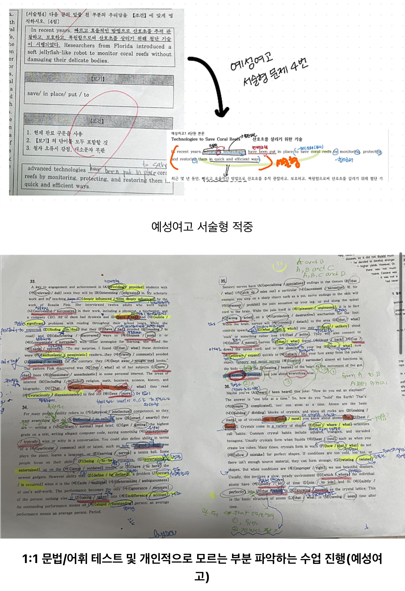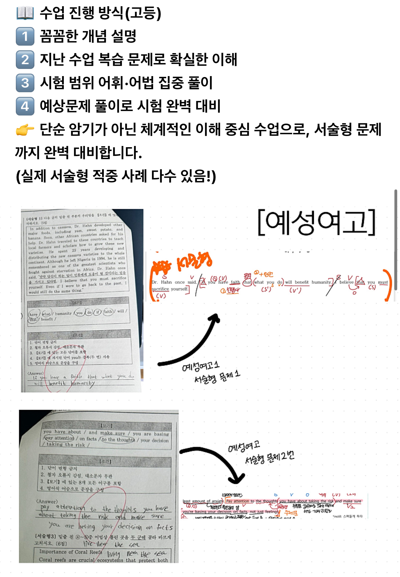 아이 스스로 모르는 부분을 정확히 파악하는 것, 그것이 성적 향상의 시작입니다. 하지만 많은 학생들은 자신이 무엇을 모르는지조차 알지 못합니다. 저희 수업에서는 문법•어휘 테스트를 통해 학생이 직 접 문제를 풀어보며 약점을 발견하고, 단순 정답 암기가 아니라 '왜 그 문법이 와야 하는 지'를 이해하도록 지도합니다. ✔️아이들의 수준에 맞춰 기초부터 차근차근, 확실 한 이해를 바탕으로 실력을 쌓아가며 결국 시험에서 자신 있게 풀 수 있는 힘을 만들어 줍 니다.