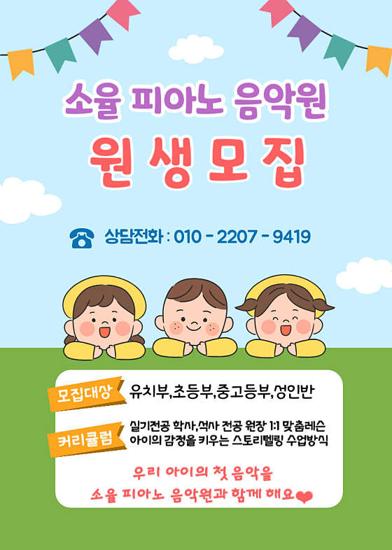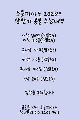 안녕하세요:) 아이들과 즐겁게 음악으로 교감하는 소율피아노입니다 저희 소율피아노는 1:1 원장직강과 주3회 정원제 수업으로 매일 학습하는 수업보다 효율적으로 수업을 받을수 있습니다. 수업중에는 상담이 어려워 01022079419로 상담예약 부탁드립니다:)