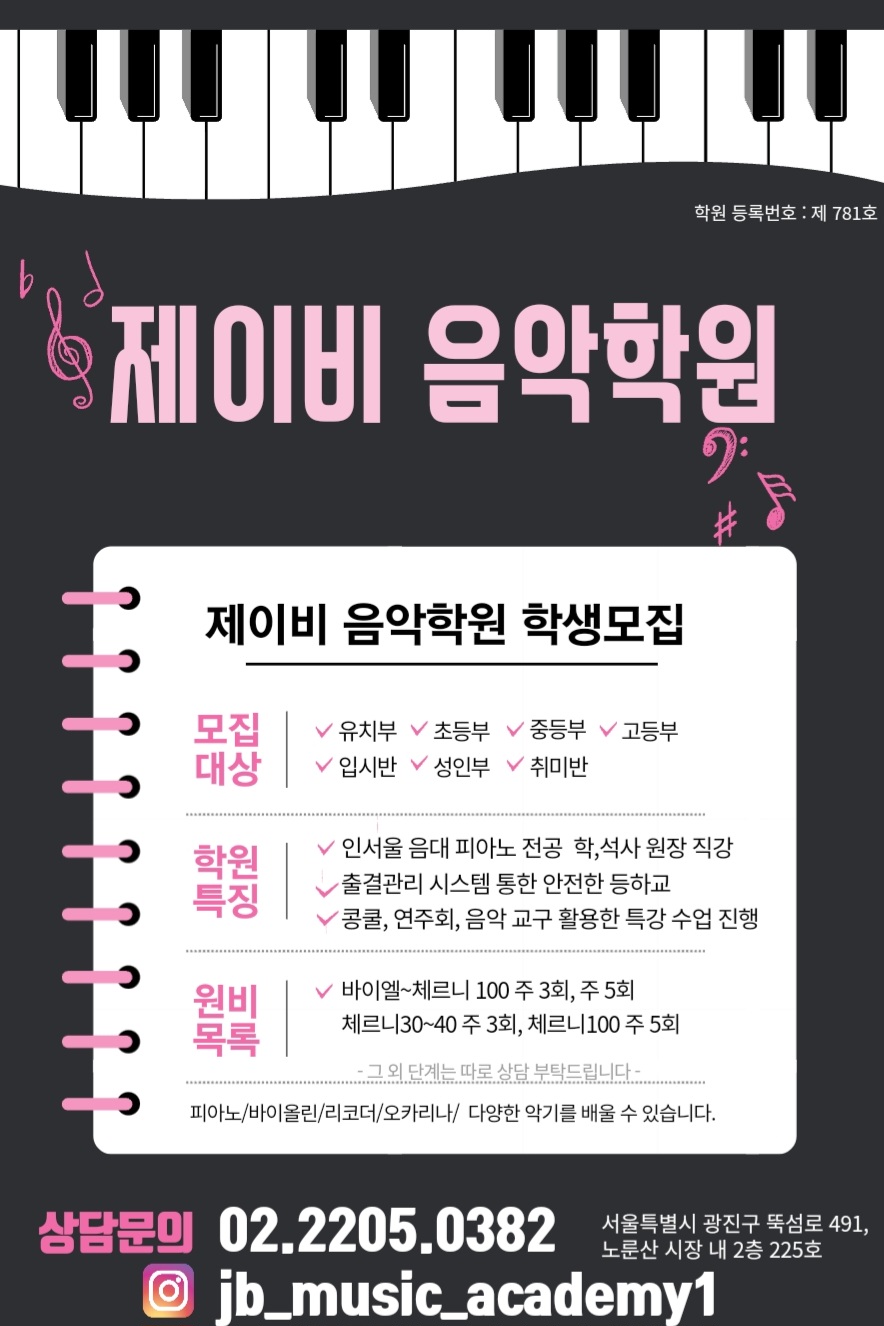 10여년의 개인레슨 및 학원 노하우를 바탕으로 음악을 가르칩니다. 아이들이 음악을 사랑하고 즐길 수 있는 방법을 알고 싶으시다면 언제든지 문의 주세요☺️ [유치부/초등부/중고등부/입시반/성인반] ▪︎피아노 전공 원장직강 1대1 레슨 ▪︎음악이론 특강 수업 진행 ▪︎원내 미니연주회&위클리 진행 ▪︎출결관리 시스템 통한 안전한 등하교