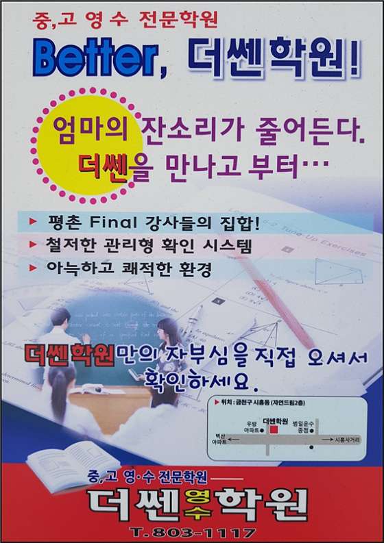금천구 시흥동에 있는 더쎈영수학원입니다. 동일여고, 문일고, 금천고, 동일중, 시흥중, 문일중, 탑동초, 금동초, 백산초 전문. 영어/수학 전문학원 입니다. 내신/입시 확실하고 꼼꼼하게 관리합니다.